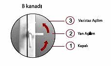 Öncelikle üzerinde sürgü olan kaanadın (A) sürgüleri kilitlenir. Diğer kanat (B) kapatılır. Kol 2 No'lu konumdan 1 No'lu konuma getirilerek kanat kilitlenir.